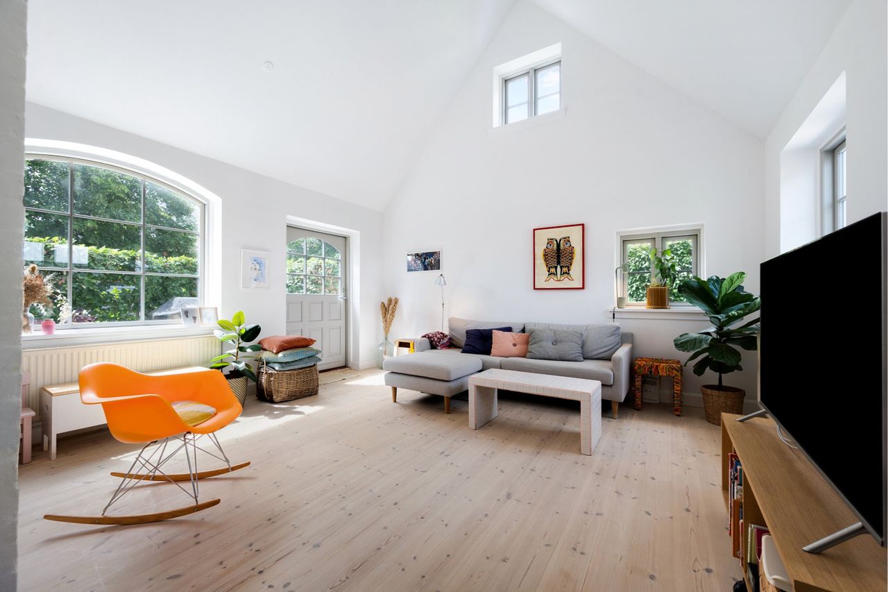 med knap 5 meter til loftet til kip. Fra opholdsstuen med lysindfald fra 3 sider gennem store smukke sprodsede vinduer