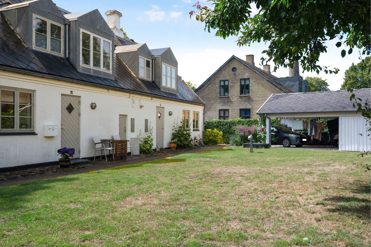 i det pittoreske landsbymiljø "Bondebyen" i den nordvestlige del af Kgs. Lyngby nær Mølleåen, Lyngby Sø og