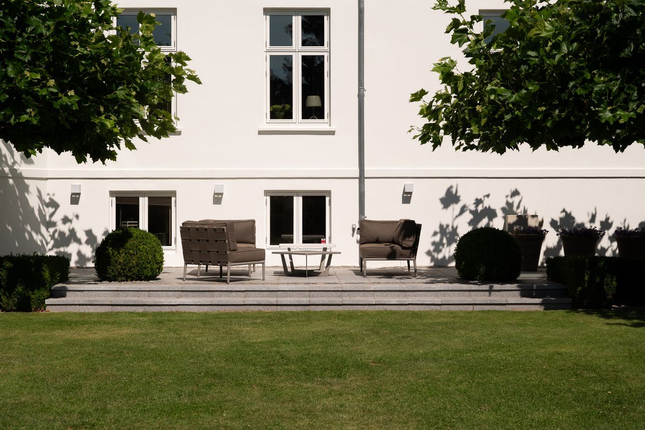 Førstesalen byder på tre store værelser og to elegante badeværelser, hvoraf det ene værelse har adgang til en altan med udsigt over den frodige have.