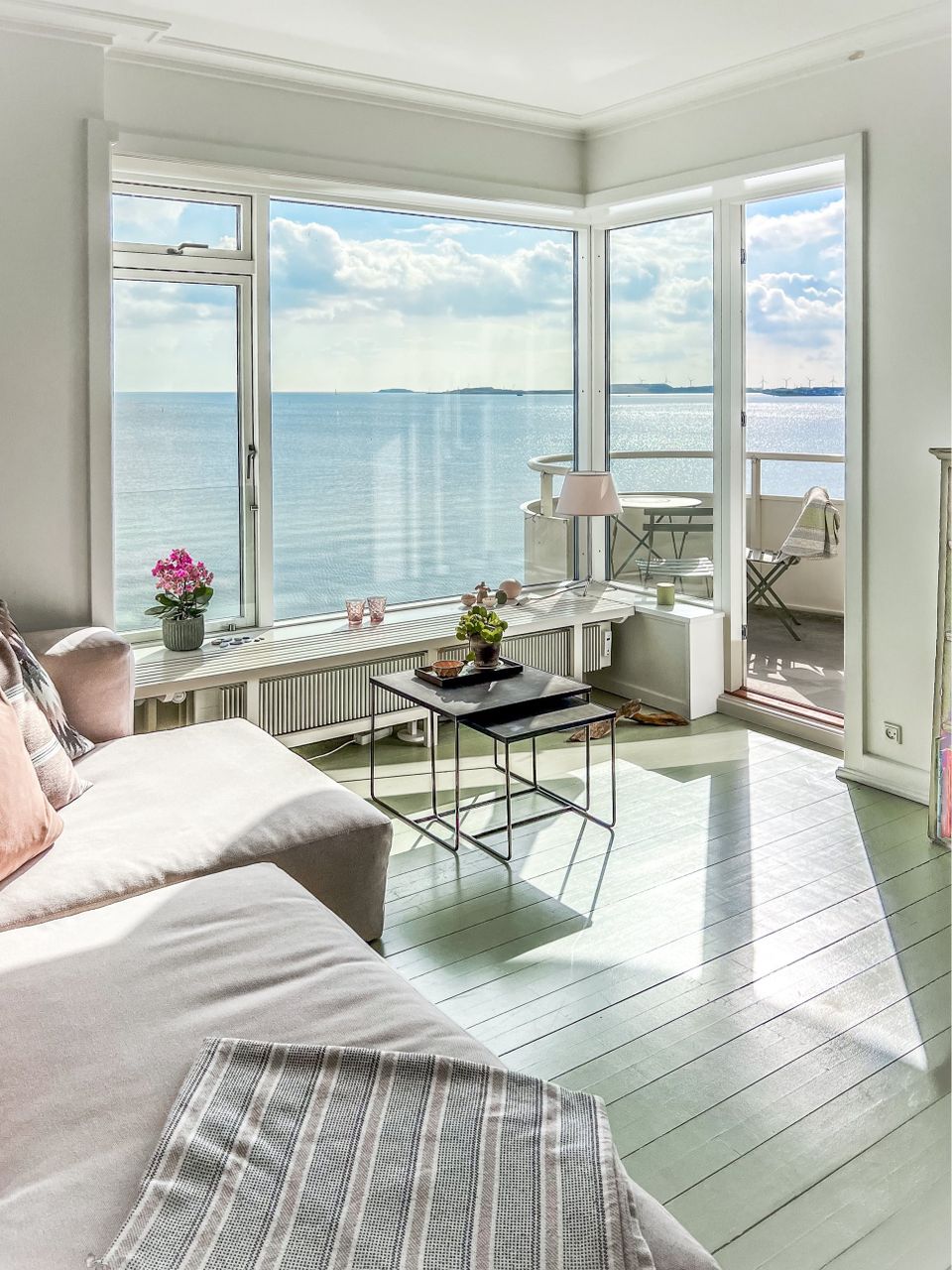 Entre, imponerende opholdsstue med panoramaudsigt over Øresund med udgang til altan med den