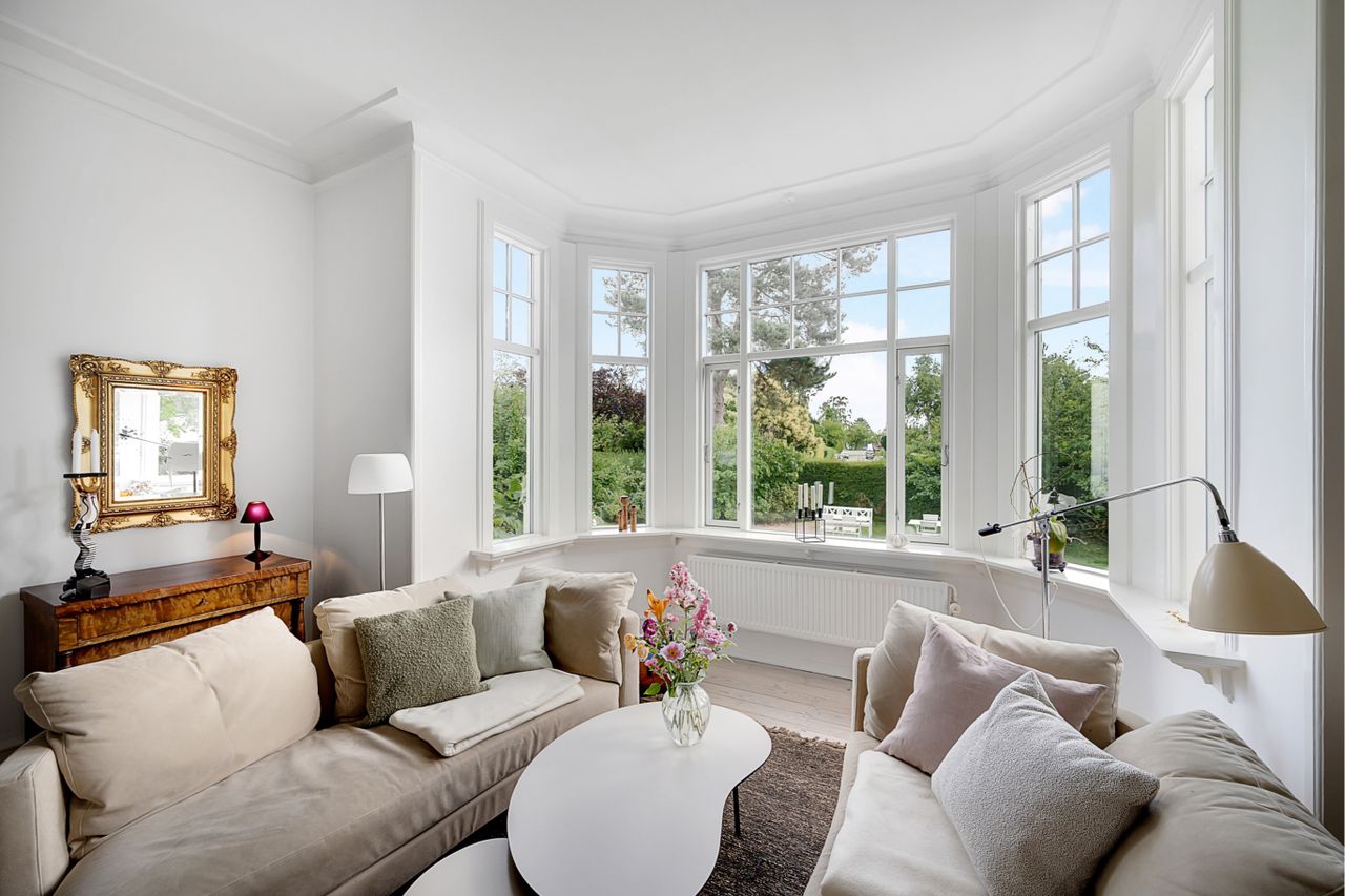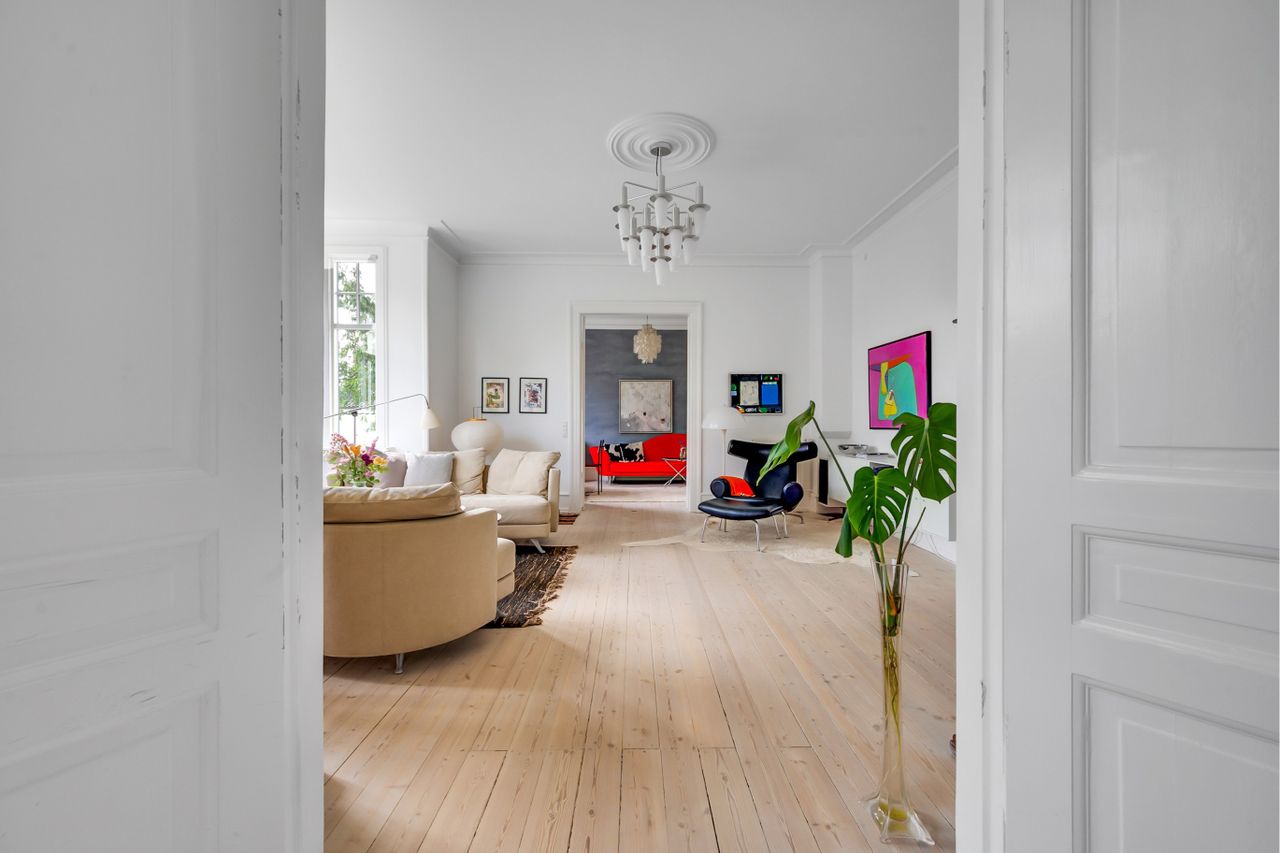Pragtfuld stor og gennemistandsat liebhaverbolig i stueetagen af markant hvidpudset herskabsvilla,