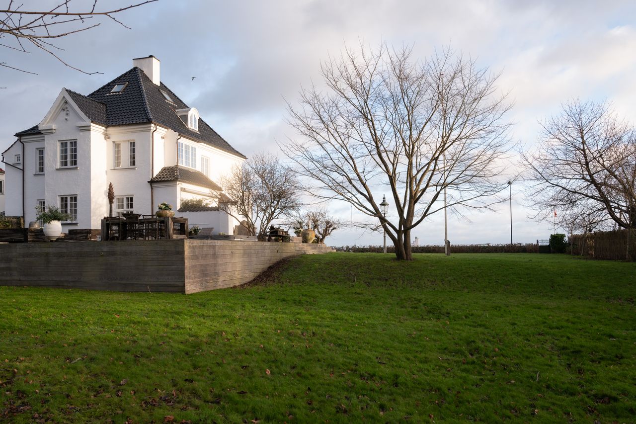 Den hvidpudsede palævilla er belagt med sorte glaserede teglsten, kobbertagrender og smukke hvide palævinduer, som giver en betagende udsigt over Øresund fra alle husets 3 etager.