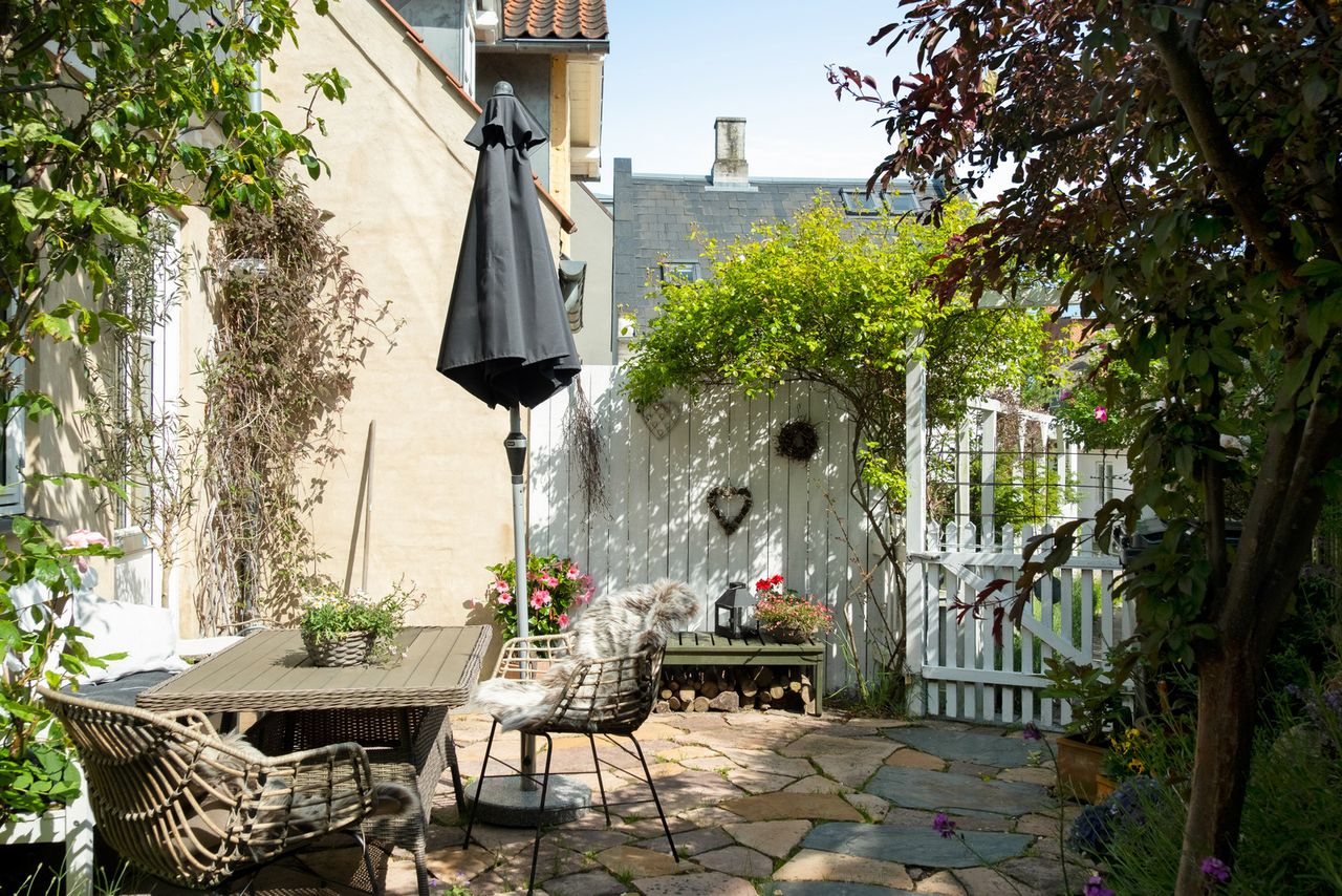 Grunden på 168 m² er anlagt med fin flisebelagt gårdhave mod syd og med skøn terrasse mod vest og har dermed sol hele dagen.