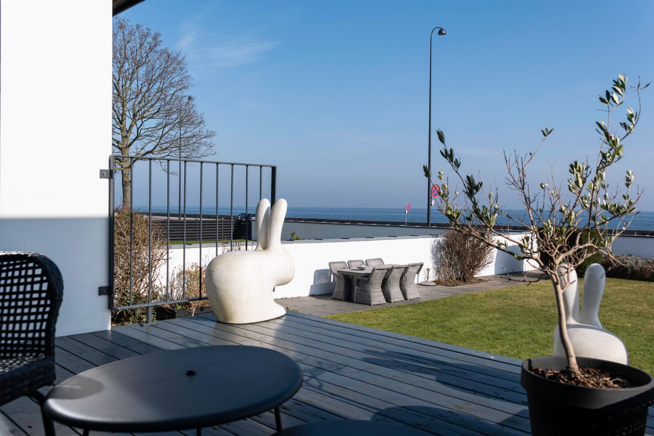 Haven er enkelt anlagt med græsplæne, loungeafdeling og en havelåge ud til Strandvejen med udsigt over Øresund.