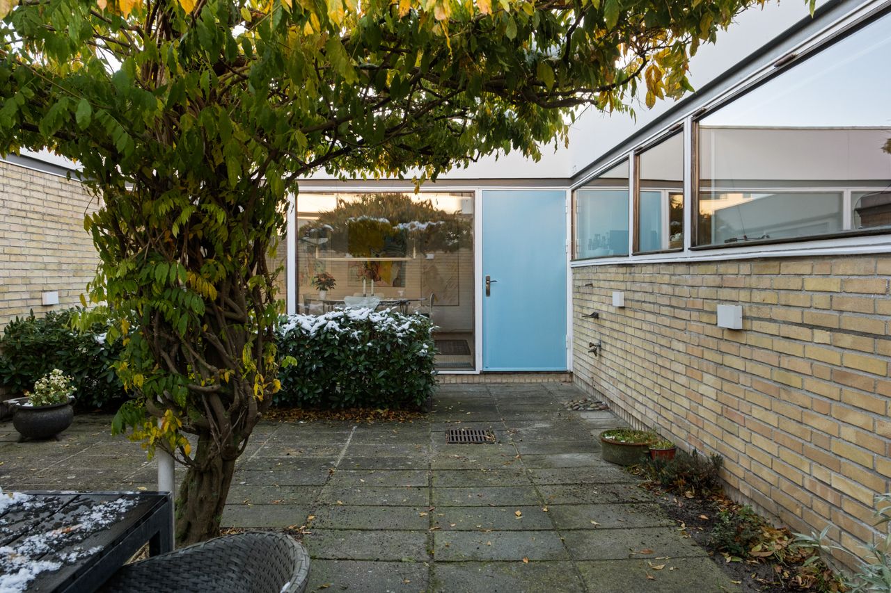 Ankomst via privat lukket gårdhave til den karakteristiske blåmalede hoveddør til boligen, der indeholder 180 m² funktionel bolig i ét plan bygget omkring den helt ugenerte lukkede atriumgård.
