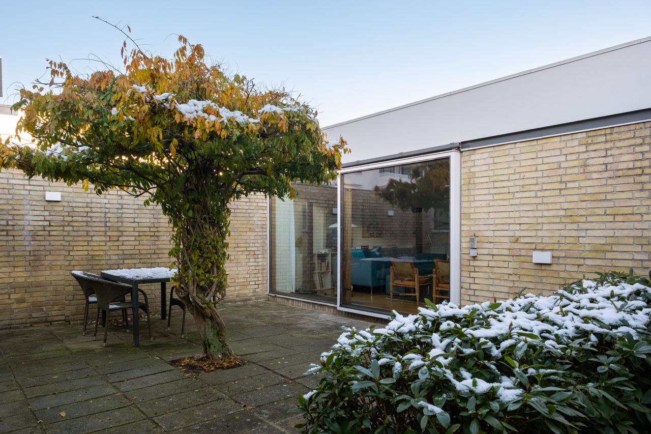 Et af de ikoniske fredede atriumhuse tegnet af arkitekt Arne Jacobsen og opført i 1961, pragtfuldt beliggende vis-à-vis Bellevue Strand med udsigt over Øresund til Sverige.