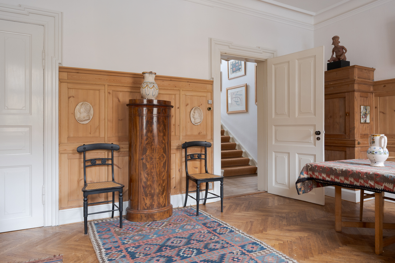 I de store højloftede stuer er der høje vinduespartier med et smukt lysindfald. Der er smukke, velholdte parket- og plankegulve, originale vægpaneler og indbyggede skabe.