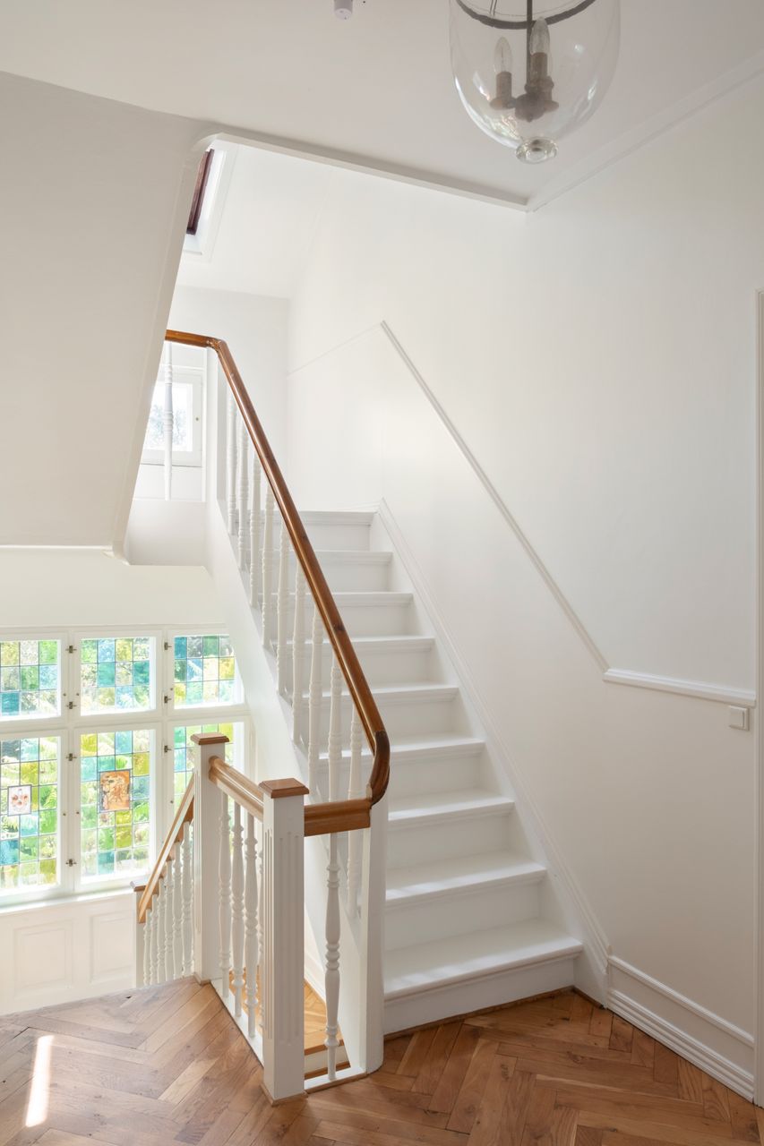 På 1. sal: stor repos, soveværelse med udgang til stor vestvendt altan, 3 store værelser og stort badeværelse. Fin trappe fører til tagetagen, der indeholder 3 store loftsrum, der ikke er godkendt til beboelse.