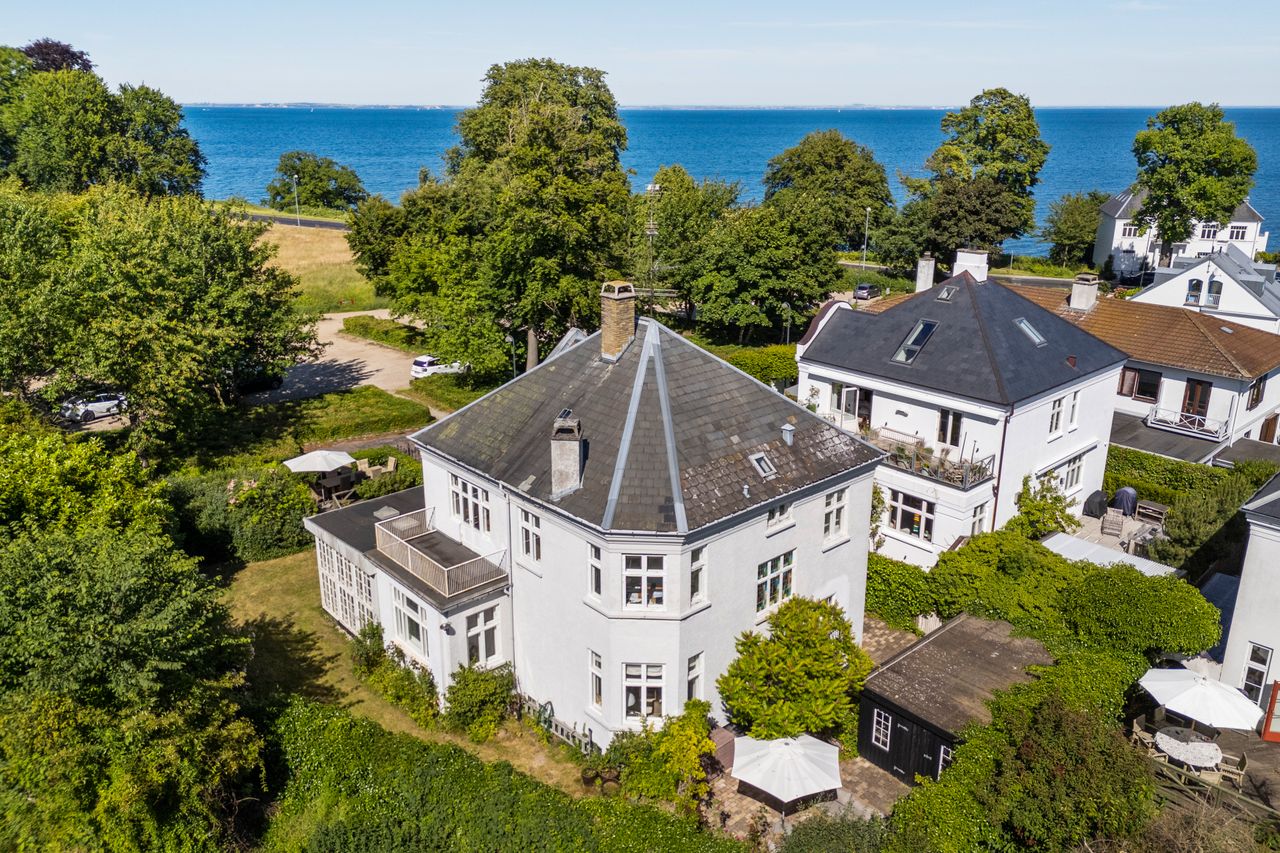 Klassisk herskabelig patriciervilla, opført i 1914 med lysegrå pudsede facader, hvidmalede vinduer og tag belagt med naturskifer, beliggende på 620 m² grund for enden af lukket vej som nabo til Eremitagesletten, få minutters gang fra Trepilelågen til Dyrehaven.