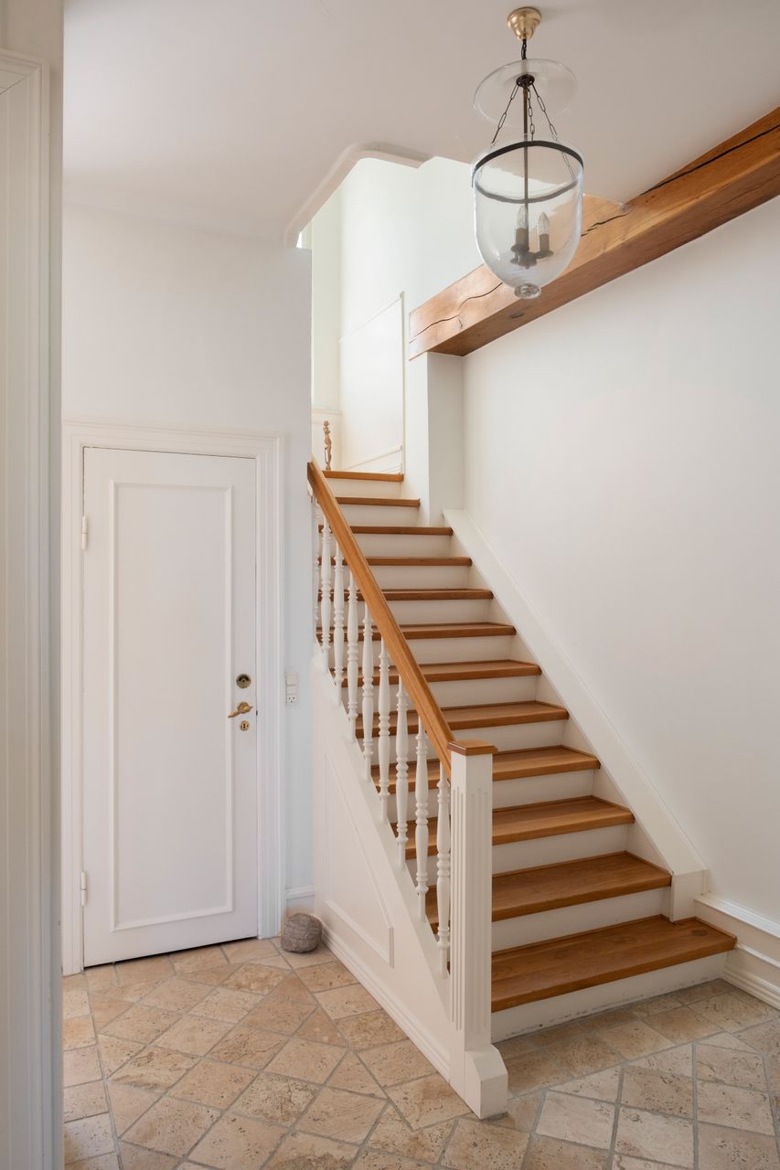 I stueplan: stor hall med masser af indbyggede garderobeskabe og trappe til 1. sal, 2 dejlige opholdsstuer, stor spisestue/alrum i åben forbindelse til køkkenet. Fra alrummet er der trin ned til charmerende ca. 28 m² stort orangeri, hvorfra der er udgang til haven.