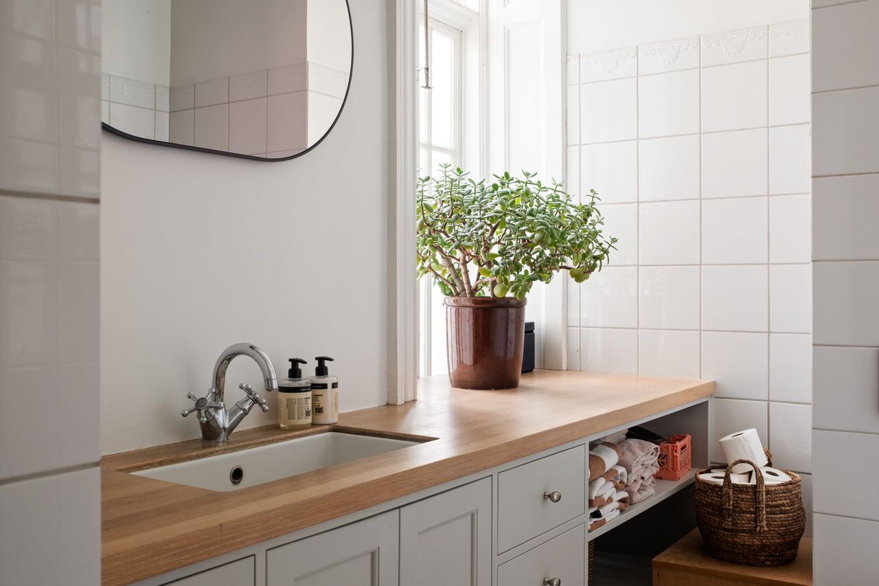 Fordelingsgang fører til værelsesafdelingen med moderne badeværelse samt 3 dejlige store soveværelser med indbyggede skabe. Bag lågerne i det snedkerfremstillede skab i gangen foran badeværelset skjuler sig vaske - og tørre maskiner.