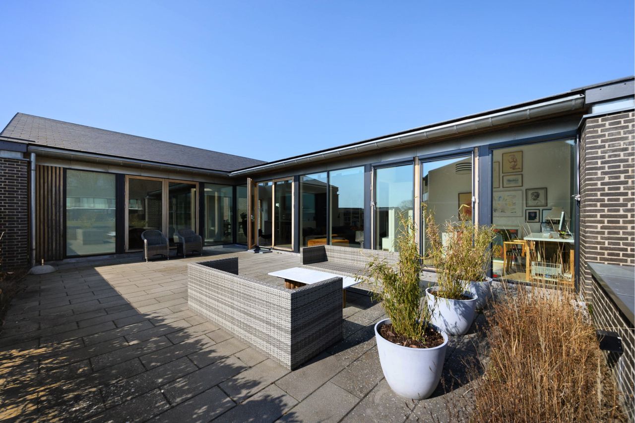 Villaen er opført af arkitekten Utzon som et lavenergihus i 2014 og indeholder 182 m² suveræn og funktionel bolig i en meget høj kvalitet i et plan med både have, terrasse og atriumgård.