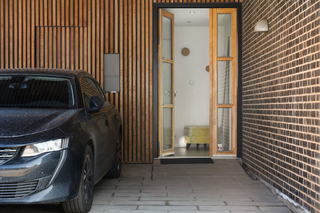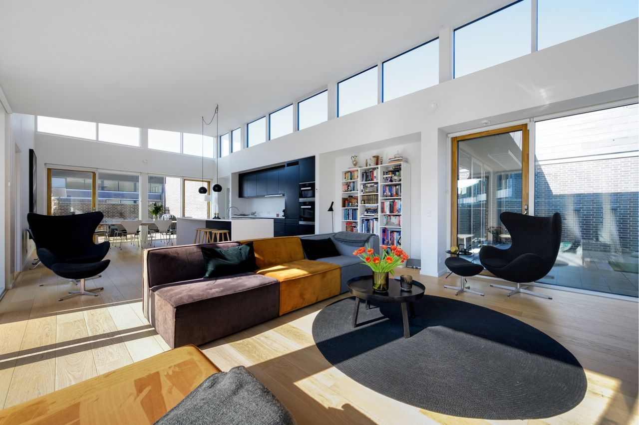 Indgang til ejendommen via dobbelt stilren carport byder velkommen til husets rummelige entré. Imponerende køkken-alrum på ca. 60 m² med ca. 5 meter til loftet med ovenlysvinduer, som giver et fantastisk lysindfald i hele rummet. Endvidere udgang til hyggelig vestvendt atriumgård samt hyggelig have med udsigt over fredede arealer.