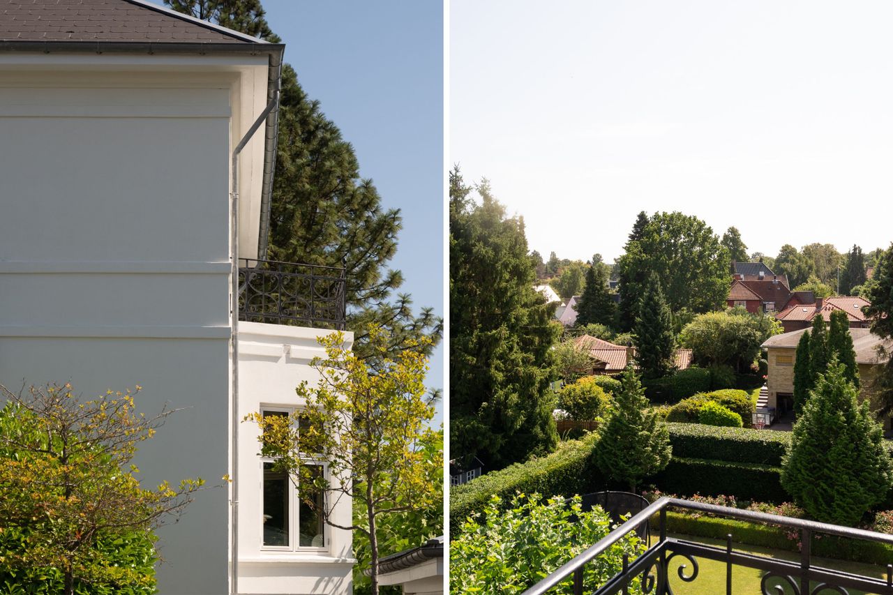 Førstesalen byder på tre store værelser og to elegante badeværelser, hvoraf det ene værelse har adgang til en altan med udsigt over den frodige have.