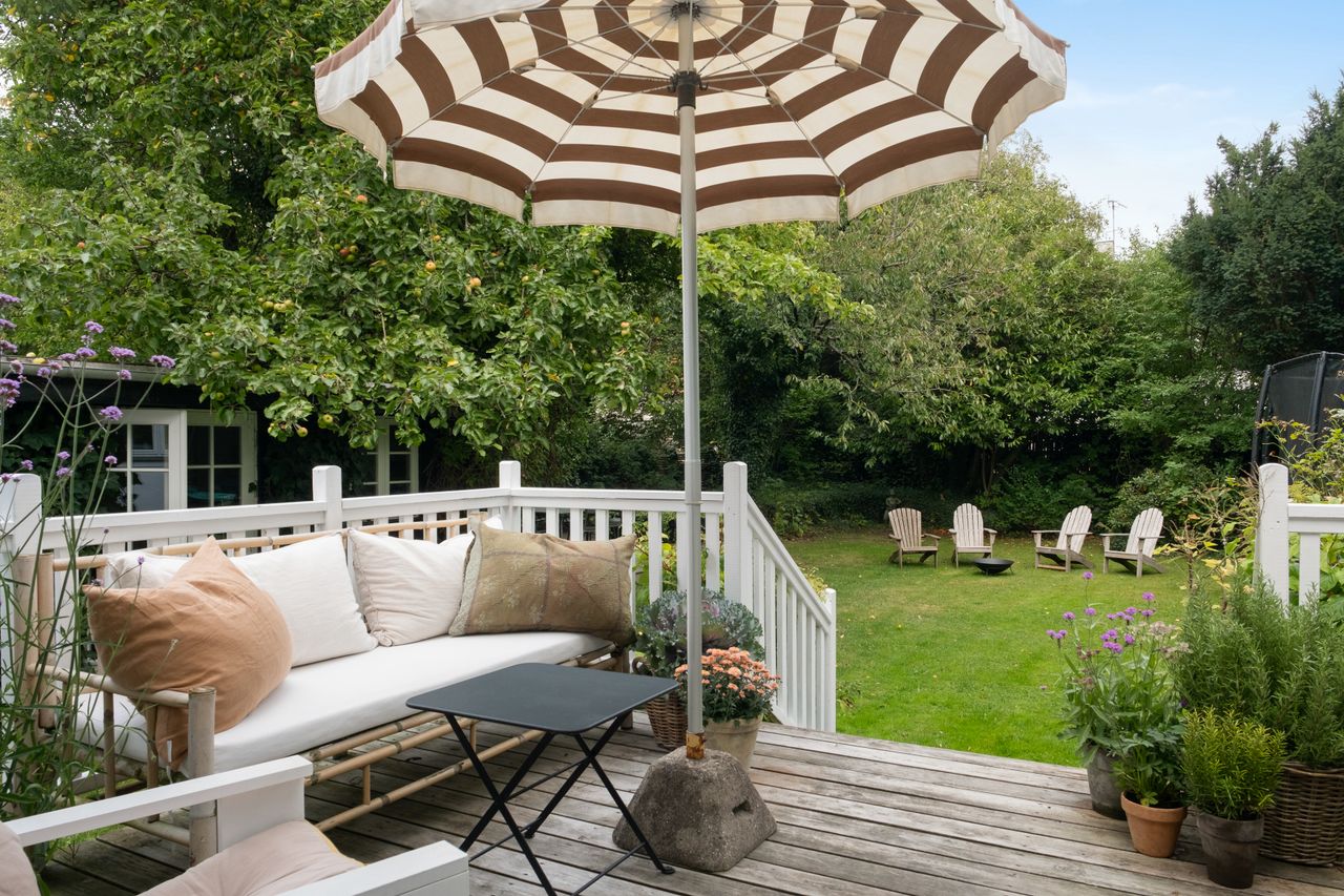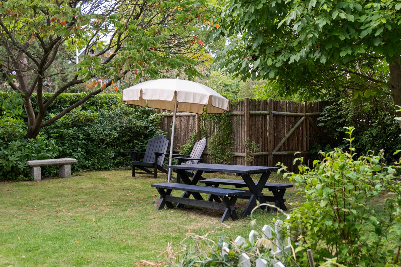 I baghaven ligger den selvstændige bygning med egen indgang og hyggelig terrasse. Den er indrettet som en selvstændig enhed med et stort alrum, eget toilet og bad, hvilket gør den ideel til både familie- og gæstebrug. Udenfor byder haven på smuk, gammel beplantning og flere solrige terrasser, som giver mulighed for både ro og sociale stunder i grønne omgivelser.