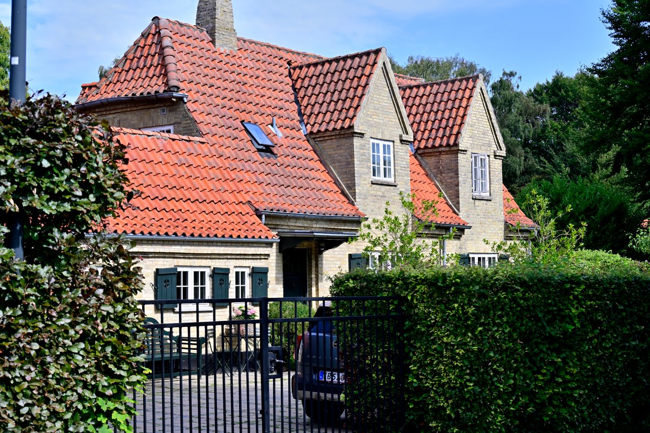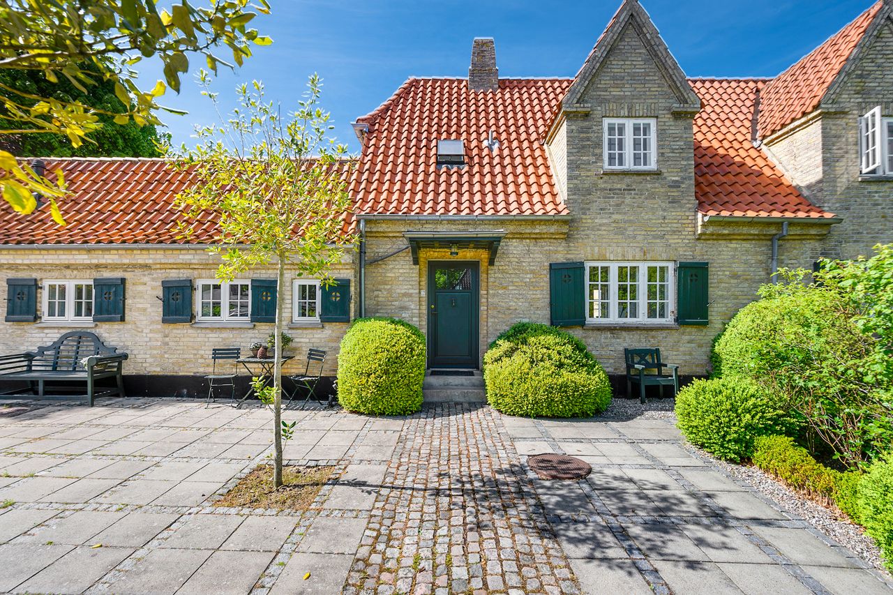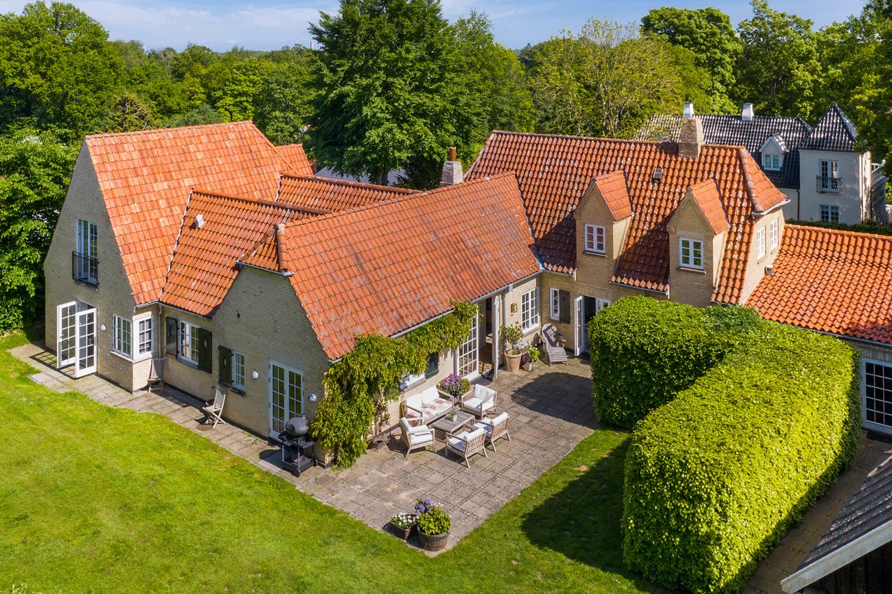 Markant herskabelig villa i Engelsk Cottage Style, opført i 1916 med facader i gule sten, hvidmalede småsprossede vinduer med grønne skodder og tag belagt med røde vingetegl, velegnet til den store børnefamilie.