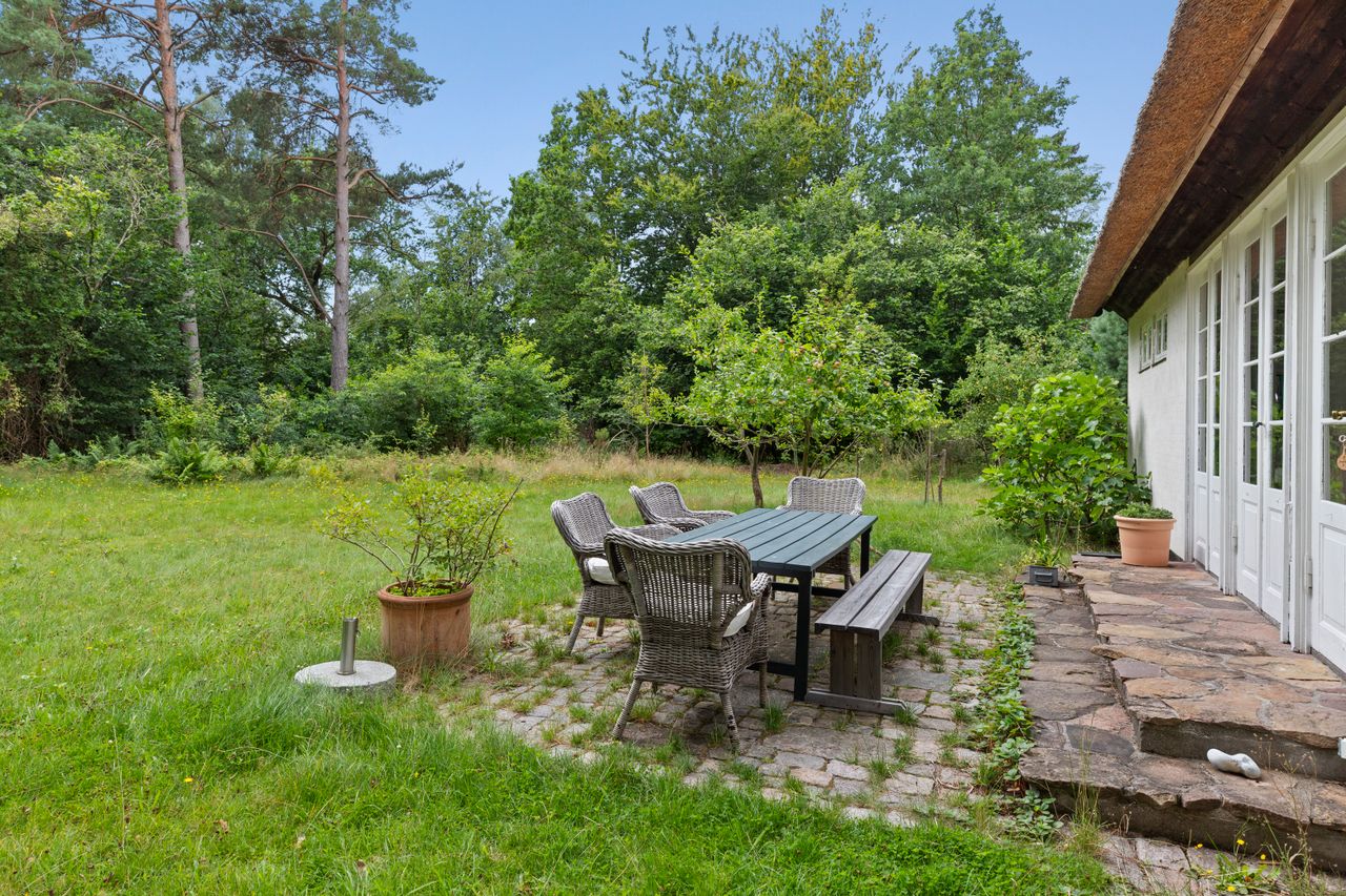 Grunden er anlagt som en skovhave, der er nem at vedligeholde og smukt harmonerer med de naturlige omgivelser. Her er rig mulighed for udeliv i private rammer og for at nyde den særlige stemning, som kun findes i plantagen.