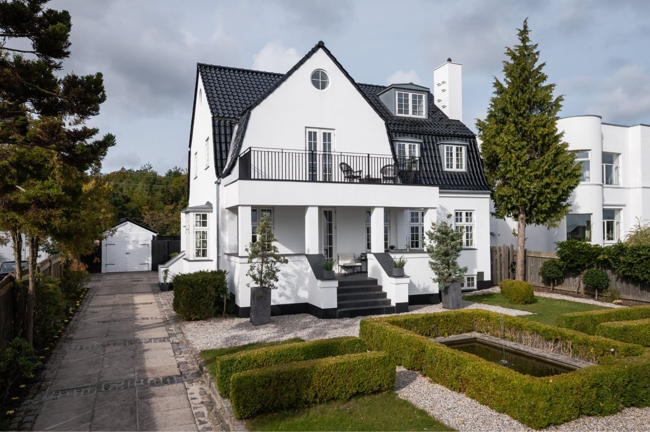 Stor herskabelig palævilla, opført i 1918, med hvidpudsede facader, hvidmalede sprossede vinduer og sort tegltag, beliggende på vestsiden af Skodsborg Strandvej på en pragtfuld, velanlagt og solrig grund på 803 m², med storslået udsigt over Øresund.