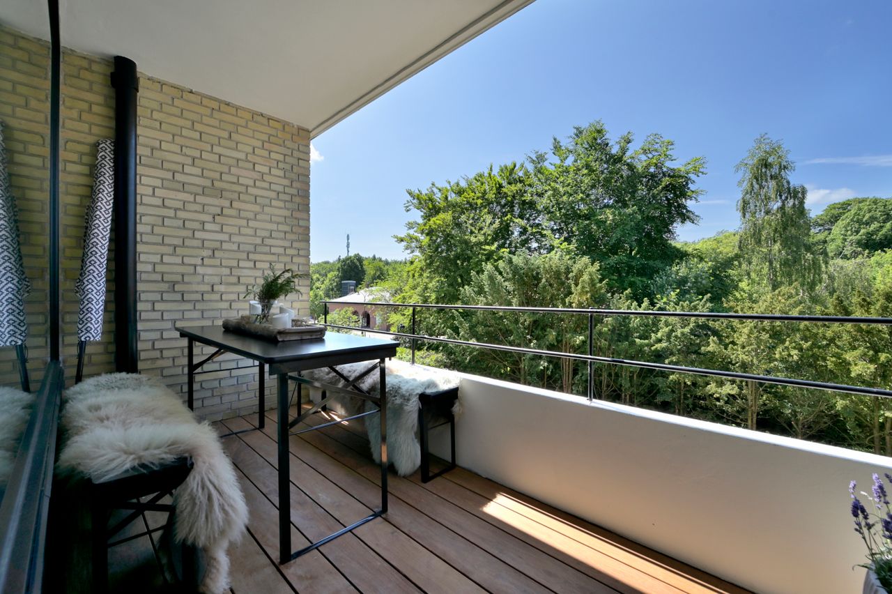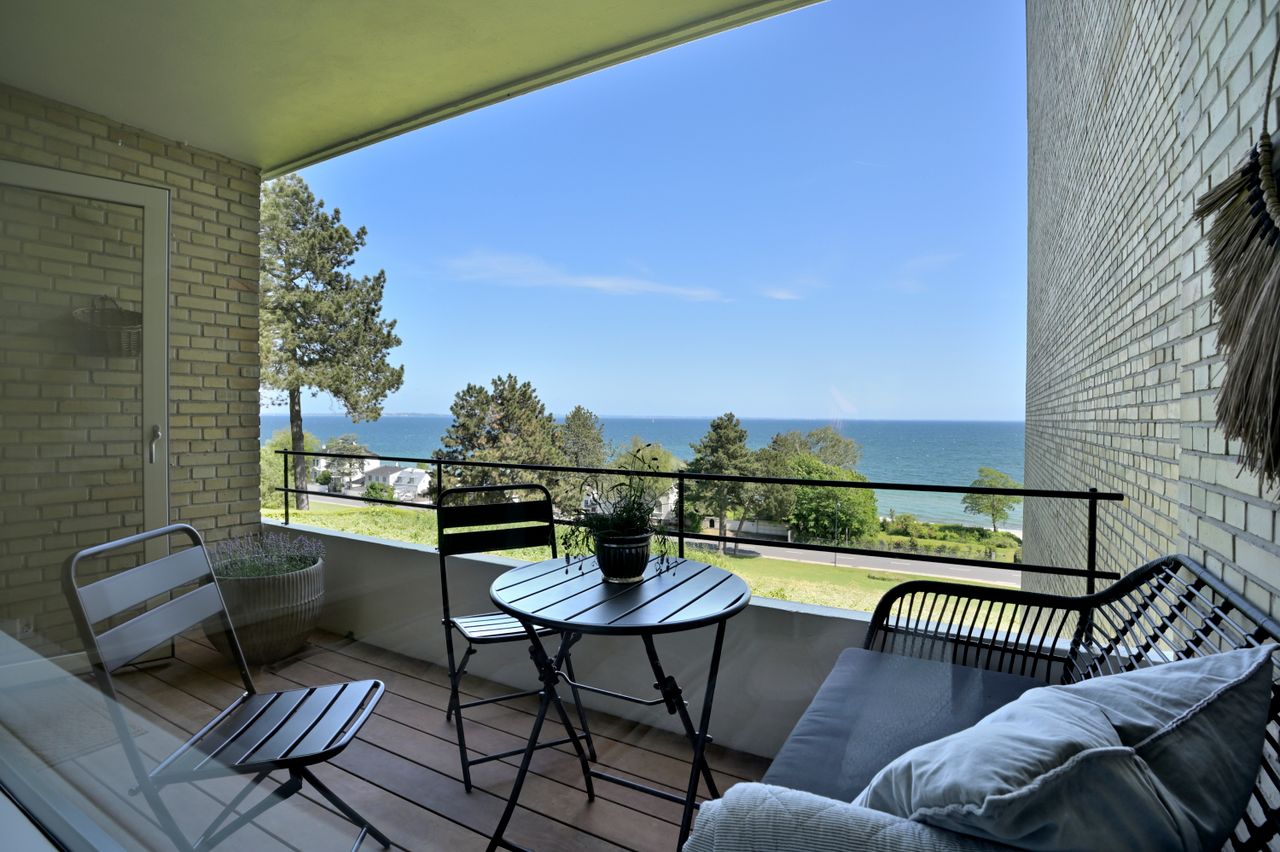 Opholdsstue og køkken/alrum har gennemstrøm af lys fra både øst og vest med hver sin udgang til stor altan, hvor det kan være svært at vælge om man skal nyde udsigten til Øresund eller til Jægersborg Hegn.