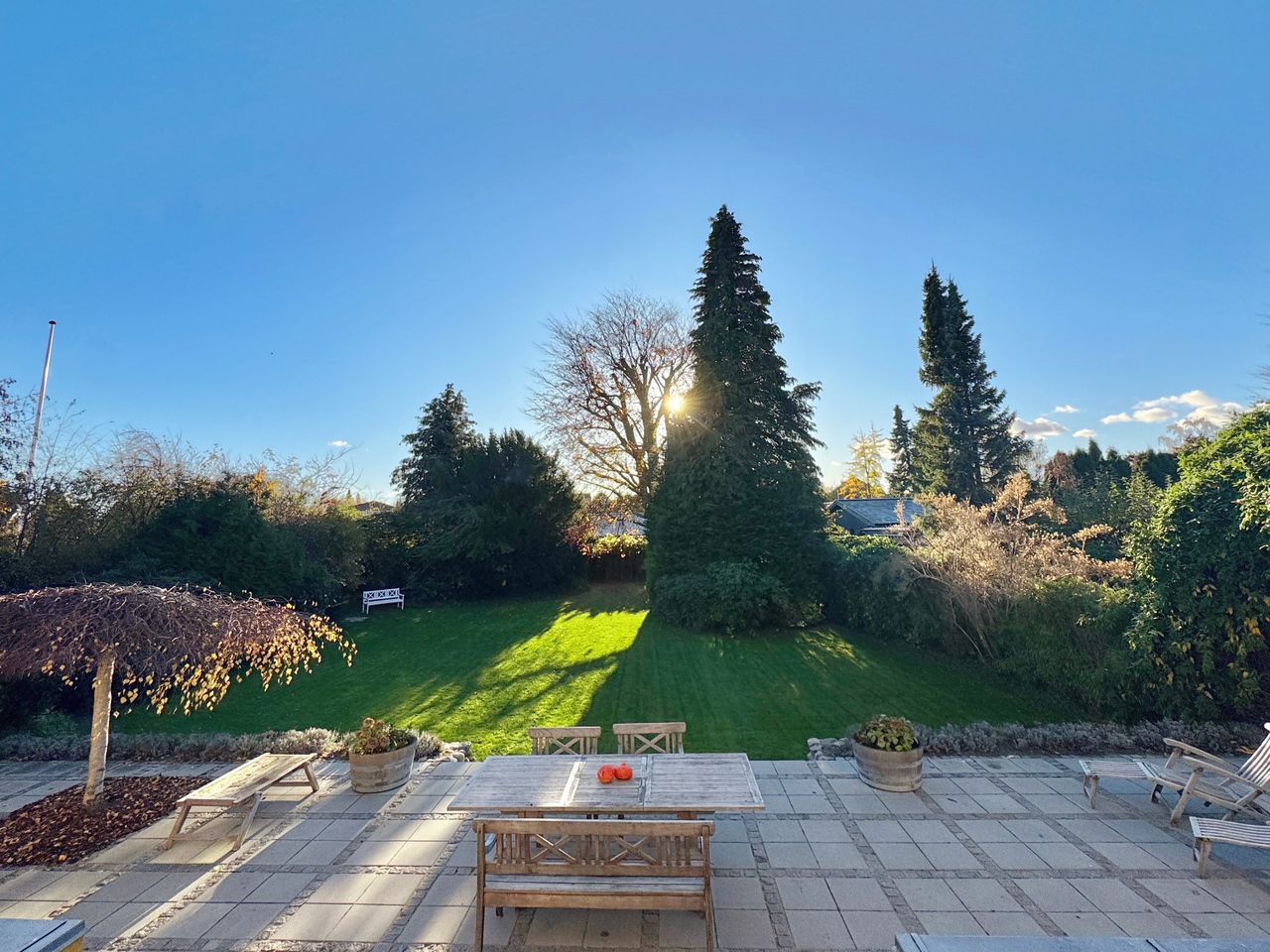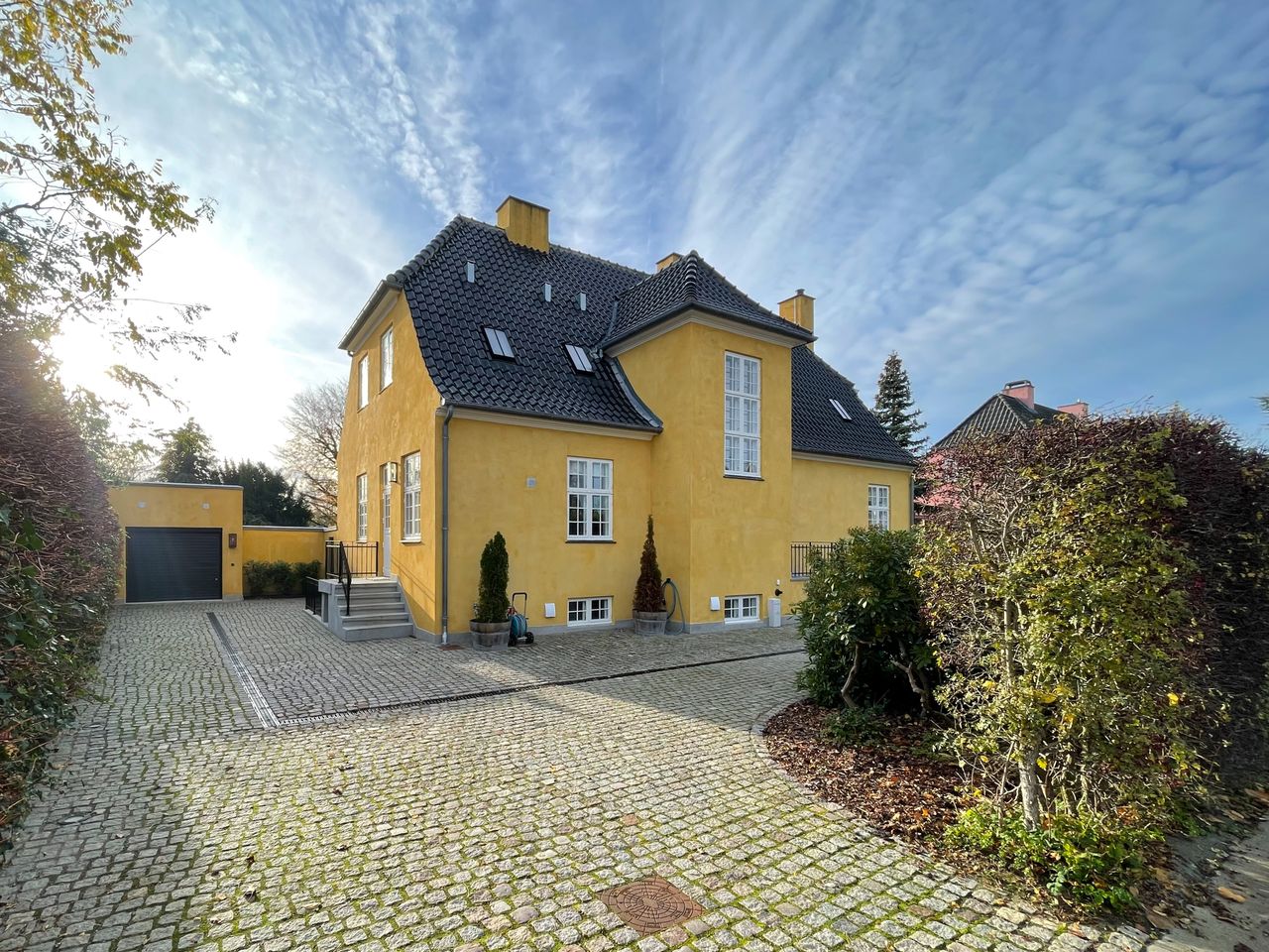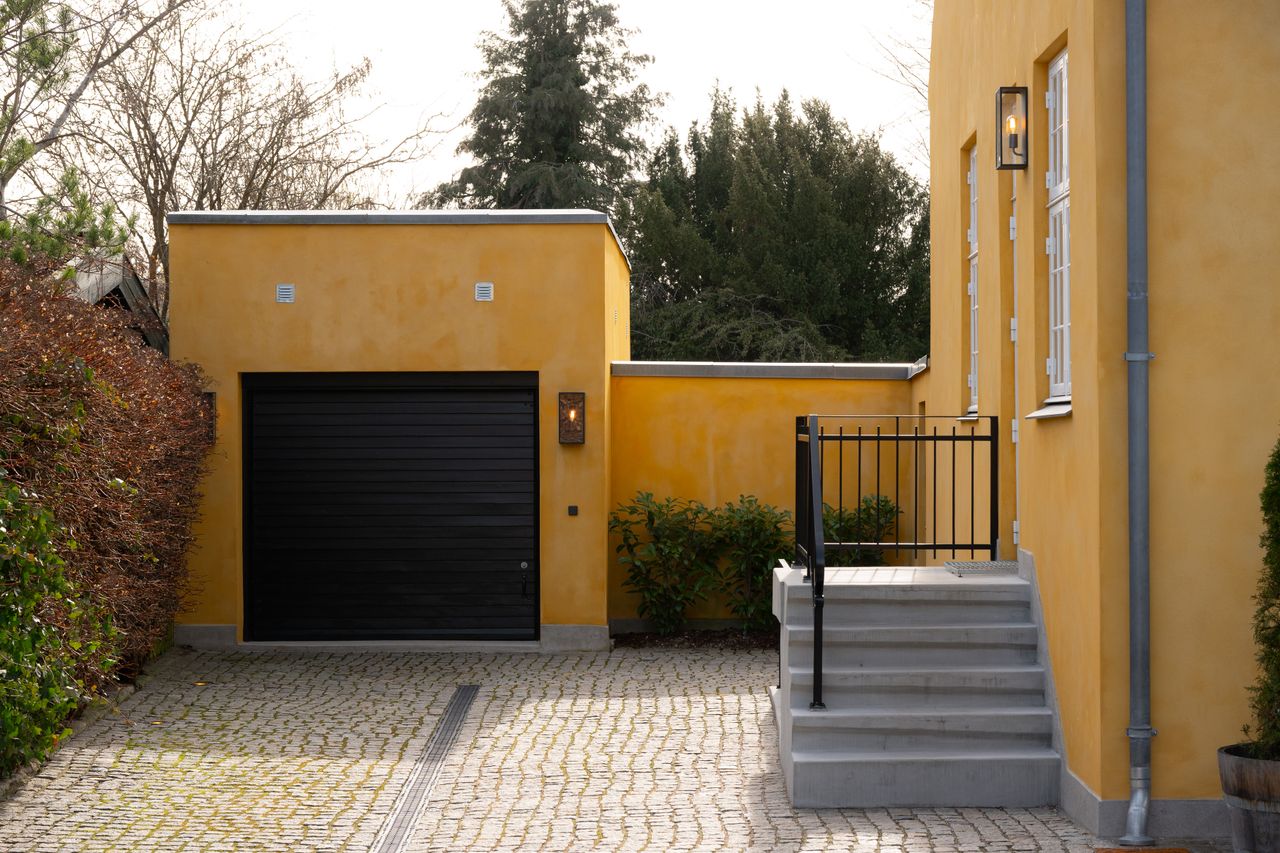 En præsentabel drive-through-indkørsel flankeret af rhododendron fører op til garagen og videre til villaens 120 m² store sydvendte terrasse - et solrigt uderum, perfekt til livsnydelse og selskabelighed. Den gamle have, med sin majestætiske rødbøg og høje cypresser, danner en grøn oase i fredelige omgivelser.
