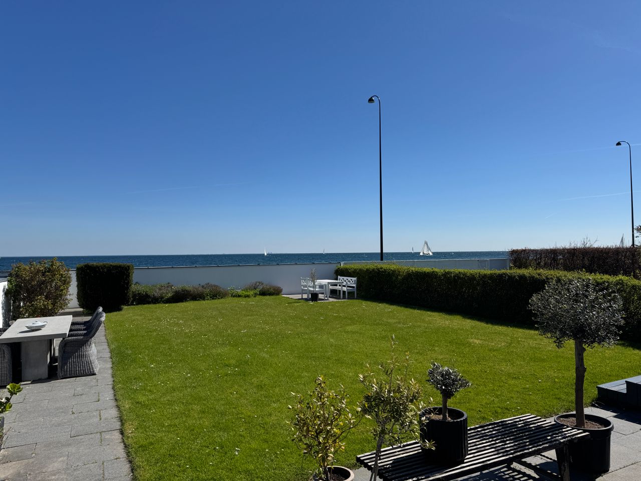 Haven er enkelt anlagt med græsplæne, loungeafdeling og en havelåge ud til Strandvejen med udsigt over Øresund.