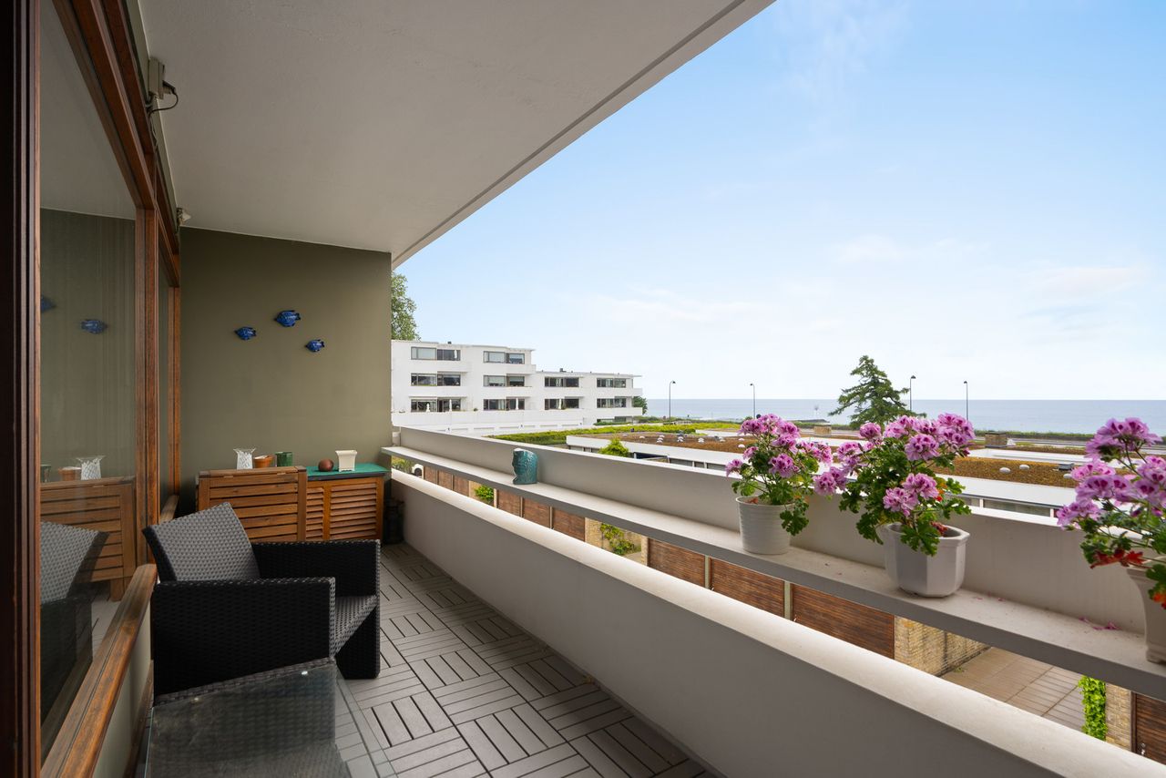 Liebhaverlejlighed med panoramaudsigt over Øresund tilbagetrukket fra Strandvejen, på 2. sal i den fredede ejendom Bellevue Bugt, opført og tegnet af Arne Jacobsen i 1959.