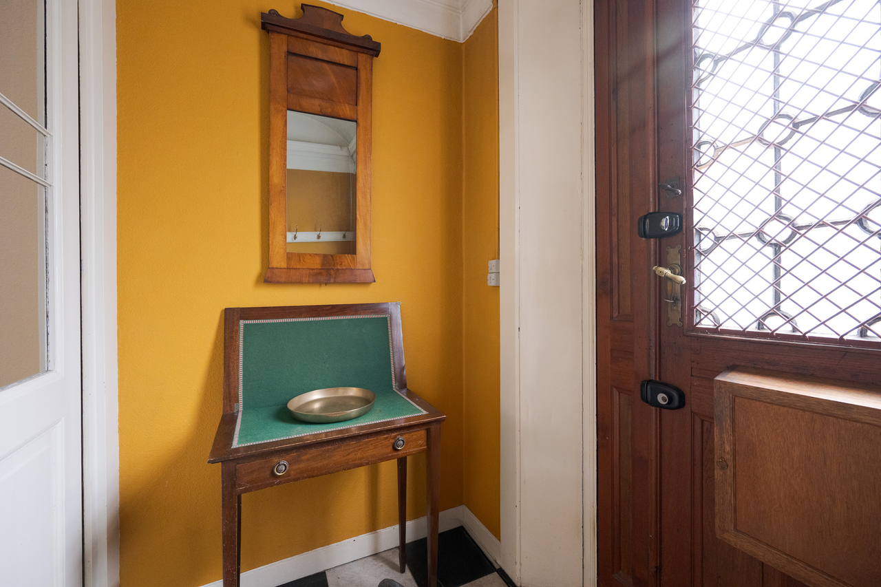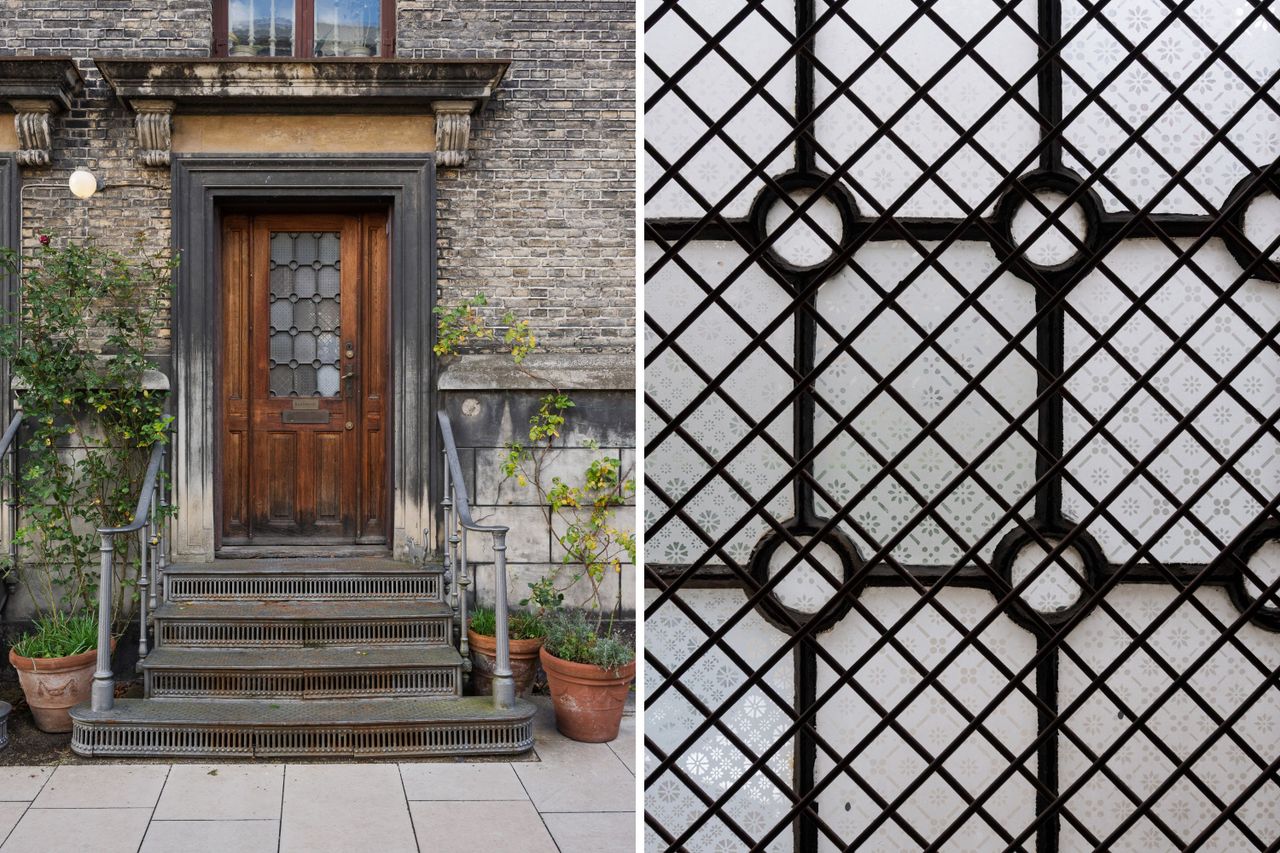 Smuk original jerntrappe med fire trin fører til indgangsparti med hoveddør og entré med trappe til alle husets etager.