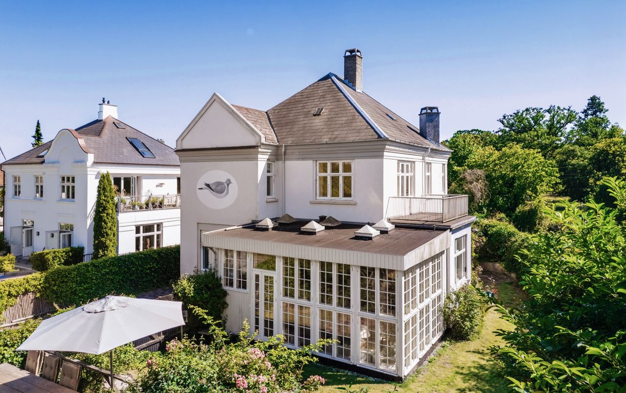 Klassisk herskabelig patriciervilla, opført i 1914 med lysegrå pudsede facader, hvidmalede vinduer og tag belagt med naturskifer, beliggende på 620 m² grund for enden af lukket vej som nabo til Eremitagesletten, få minutters gang fra Trepilelågen til Dyrehaven.