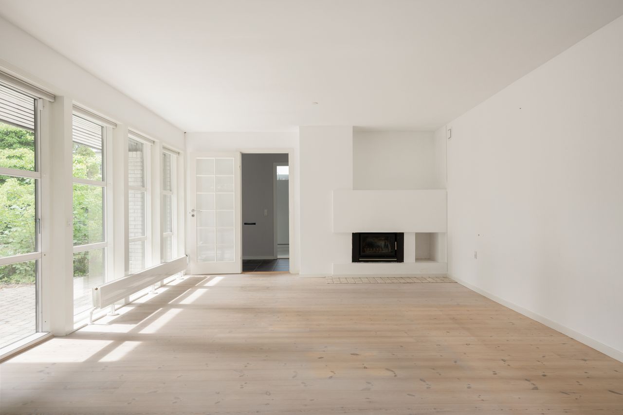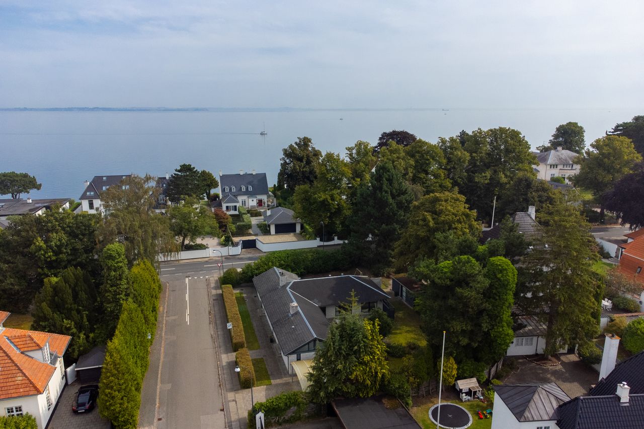 Villaen breder sig over 200 m² i ét plan. Huset ligger tilbagetrukket og ugenert på en solrig grund på 1.096 m², kun fem minutters gang fra Vedbæk Havn, stranden og Vedbæks hyggelige handelsstrøg.
