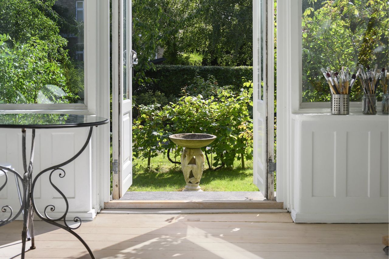 terrassen og haven og fløjdøre til charmerende verandastue med unikt lysindfald, hvorfra der er udgang til haven. I den